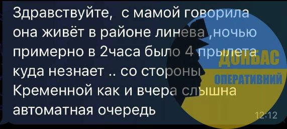 "Говорила з мамою, вона живе в районі Ліньова, вночі, приблизно близько 2 години, було 4 "прильоти", куди не знає. З боку Кремінної, як і вчора чути автоматні черги", - повідомляють у мережі.