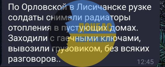 "По вулиці Орловській у Лисичанську російські солдати знімали радіатори опалення в порожніх будинках. Заходили з гайковими ключами, вивозили вантажівками, без жодних розмов", - повідомляють жителі Лисичанська.