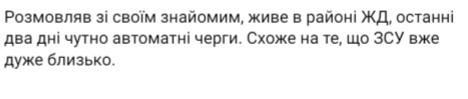 "Розмовляв зі своїм знайомим, живе в районі ж/д, останні два дні чути автоматні черги. Схоже, що ЗСУ вже дуже близько", - пишуть у мережі.