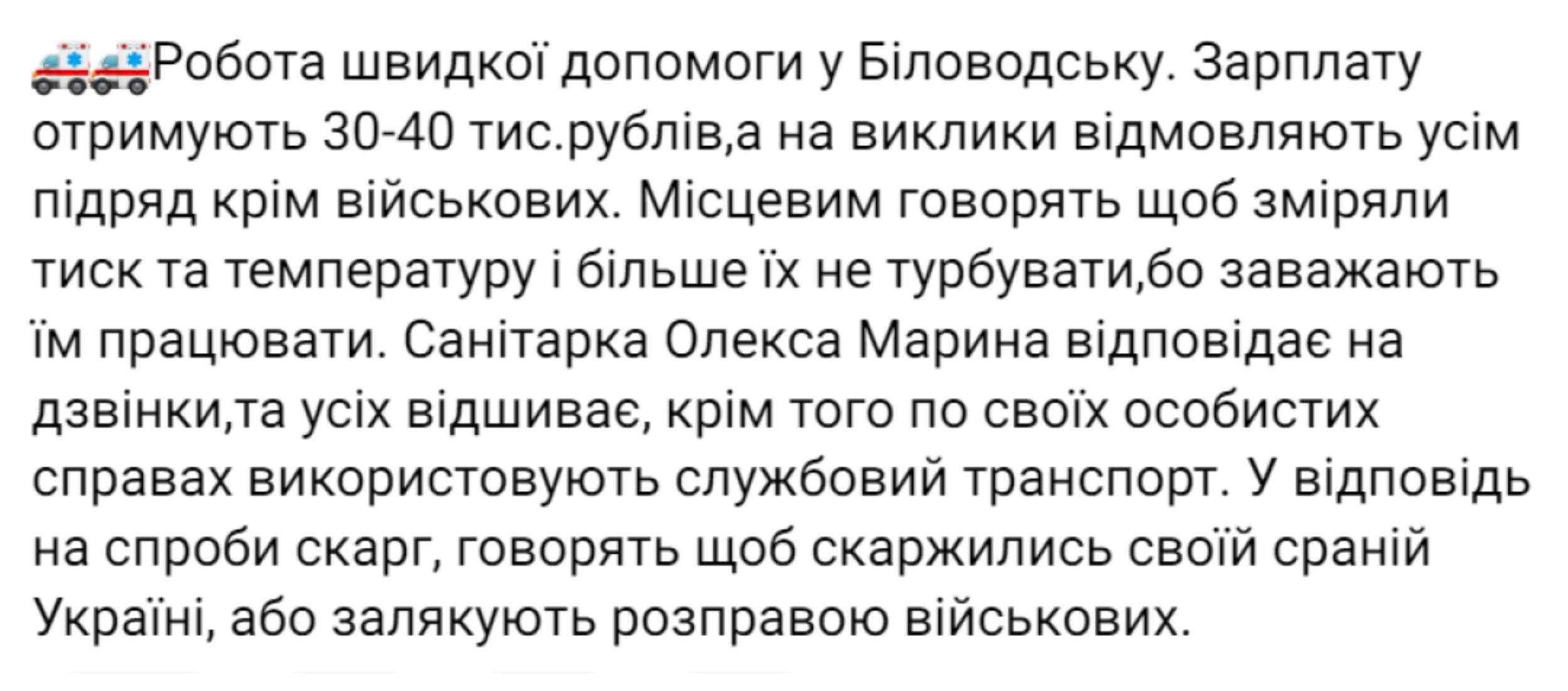 "Робота швидкої допомоги у Біловодську. Зарплату отримують 30-40 тис. рублів, а на виклики відмовляють усім поспіль крім військових. Місцевим кажуть, щоб виміряли тиск і температуру і більше їх не турбувати, бо заважають їм працювати. Санітарка відповідає на дзвінки та всіх відшиває, крім того, у своїх особистих справах використовують службовий транспорт. У відповідь на спроби скарг кажуть, щоб скаржилися своїй Україні, або залякують розправою військових", - пишуть у мережі.
