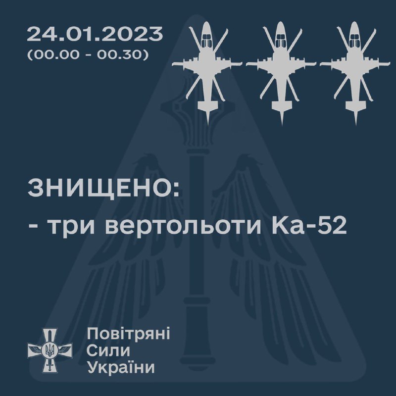 Сьогодні, 24 січня, Повітряні Сили України повідомили, що за пів години протиповітряного бою, з 00.00 до 00.30 години, наші ЗСУ на східному напрямку знищили 3 російські ударні вертольоти Ка-52.