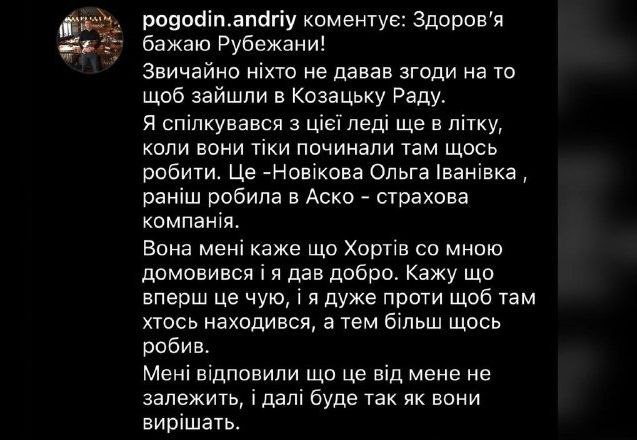 "Звичайно, ніхто не давав згоди на те, щоб зайшли в Козацьку Раду, - каже він, - я спілкувався з цією леді ще влітку, коли вони тільки починали там щось робити, це - Новікова Ольга Іванівна, раніше працювала в страховій компанії. Вона мені каже, що Хортів (колишній мер Рубіжного, колаборант - прим. ред.) зі мною домовився, та я дав добро".