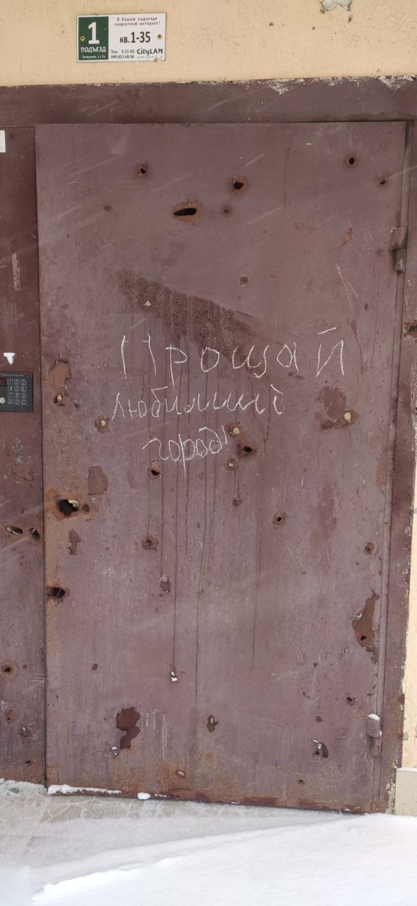 На фото, очевидно, двері одного з багатоквартирних будинків, на яких крейдою написано: "Прощавай, улюблене місто". Яка історія цього напису - невідомо. Ймовірно, людина, яка це написала, змушена була виїхати. А напис залишився, як нагадування про тисячі зламаних життів сєвєродончан.