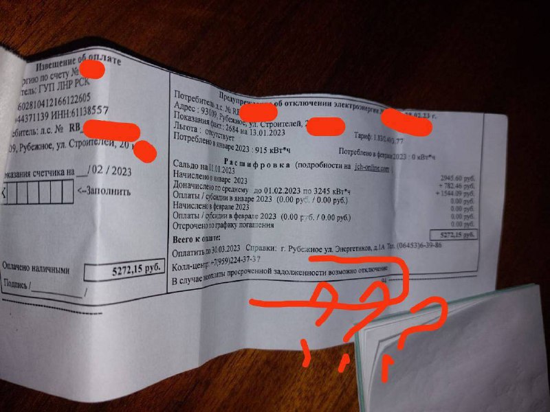 На розшифровці, яку отримали мешканці будинку на вул. Будівельників 20, нараховано за січень 2023 р. близько 780 рублів і донараховано близько 1500 рублів + сальдо - близько 3000 рублів. У результаті людині необхідно заплатити близько 5 тис. рублів за одну тільки електрику, а це половина пенсії, яку платять окупанти місцевим жителям.