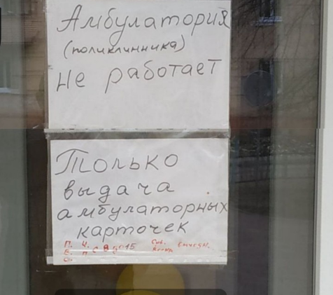 Сєвєродонецька амбулаторія №2 "офіційно" не працює: на дверях висить сиротливе оголошення, написане від руки.
