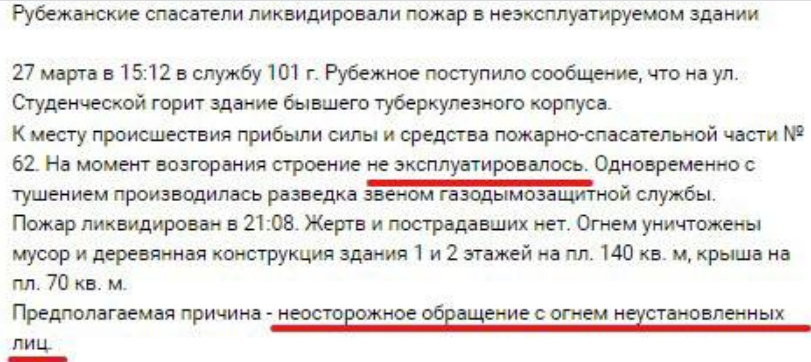 "Рубіжанські рятувальники ліквідували пожежу в не експлуатованій будівлі. 27 березня на вул. Студентській горить будівля колишнього туберкульозного корпусу. Пожежа ліквідована 21:08. Жертв і постраждалих немає. Вогнем знищено сміття та дерев'яну конструкцію будівлі 1 і 2, дах на площі 70 кв.м. Передбачувана причина - необережне поводження з вогнем невстановлених осіб", - повідомляють пропагандистські ресурси.