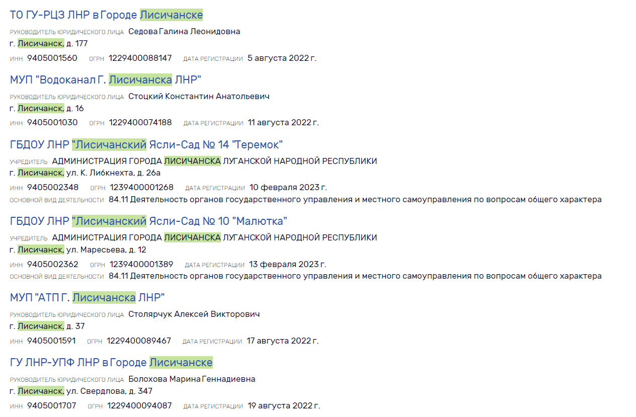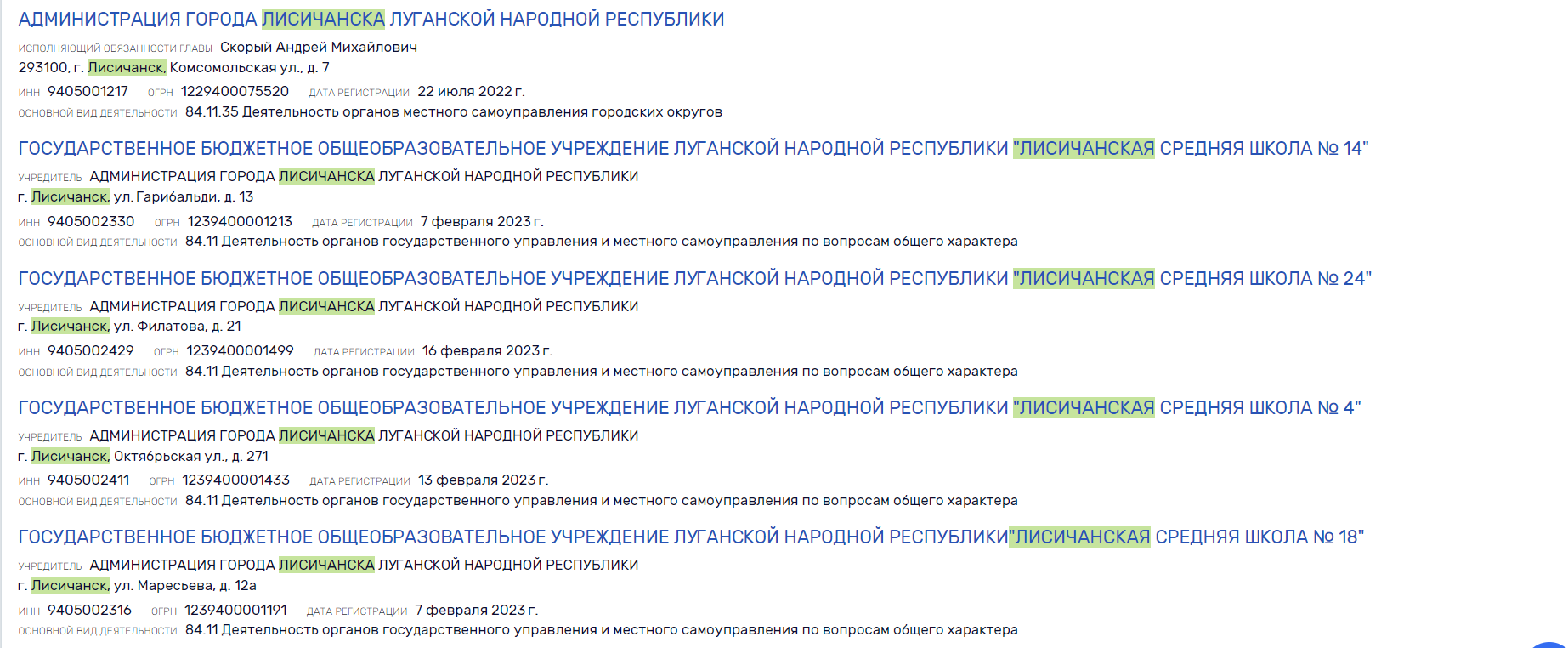 Вже кілька десятків підприємств та організацій зареєстровані за російським законодавством в Лисичанську. В місті наразі функціонує вісім шкіл та п’ять дитячих садочків. Дві школи очолюють колишні їх директори: