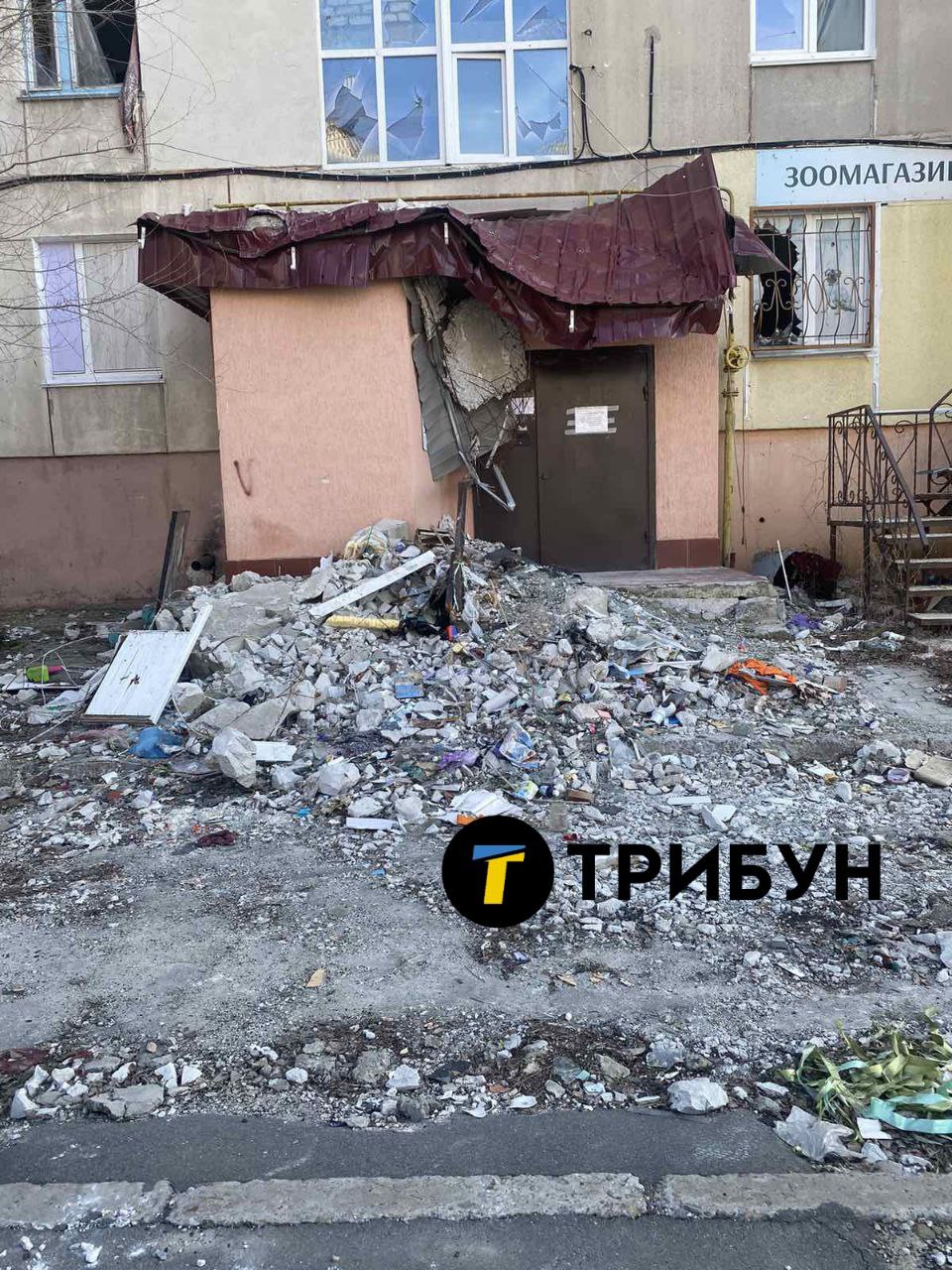 На фото показано 7-й під'їзд у будинку №5 на вулиці Курчатова. За словами місцевих жителів, у під'їзді наразі ніхто не живе, але деякі власники квартир навідуються. Будинок отримав серйозні пошкодження - на 9-му поверсі пробито плиту. В отвір потрапляє сніг та дощ, від чого стіни мокрі до самого низу.