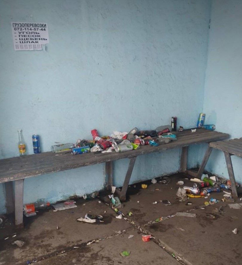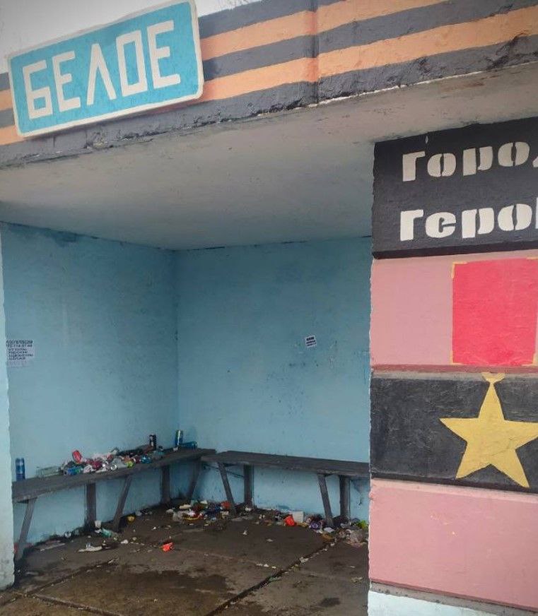 На них помітно, що напис з назвою населеного пункту знаходиться на фоні, що пофарбований в кольори георгіївської стрічки, а на стіні напис "Город Героев" і зображення зірки. На лавках та біля них купа сміття та алкоголю.