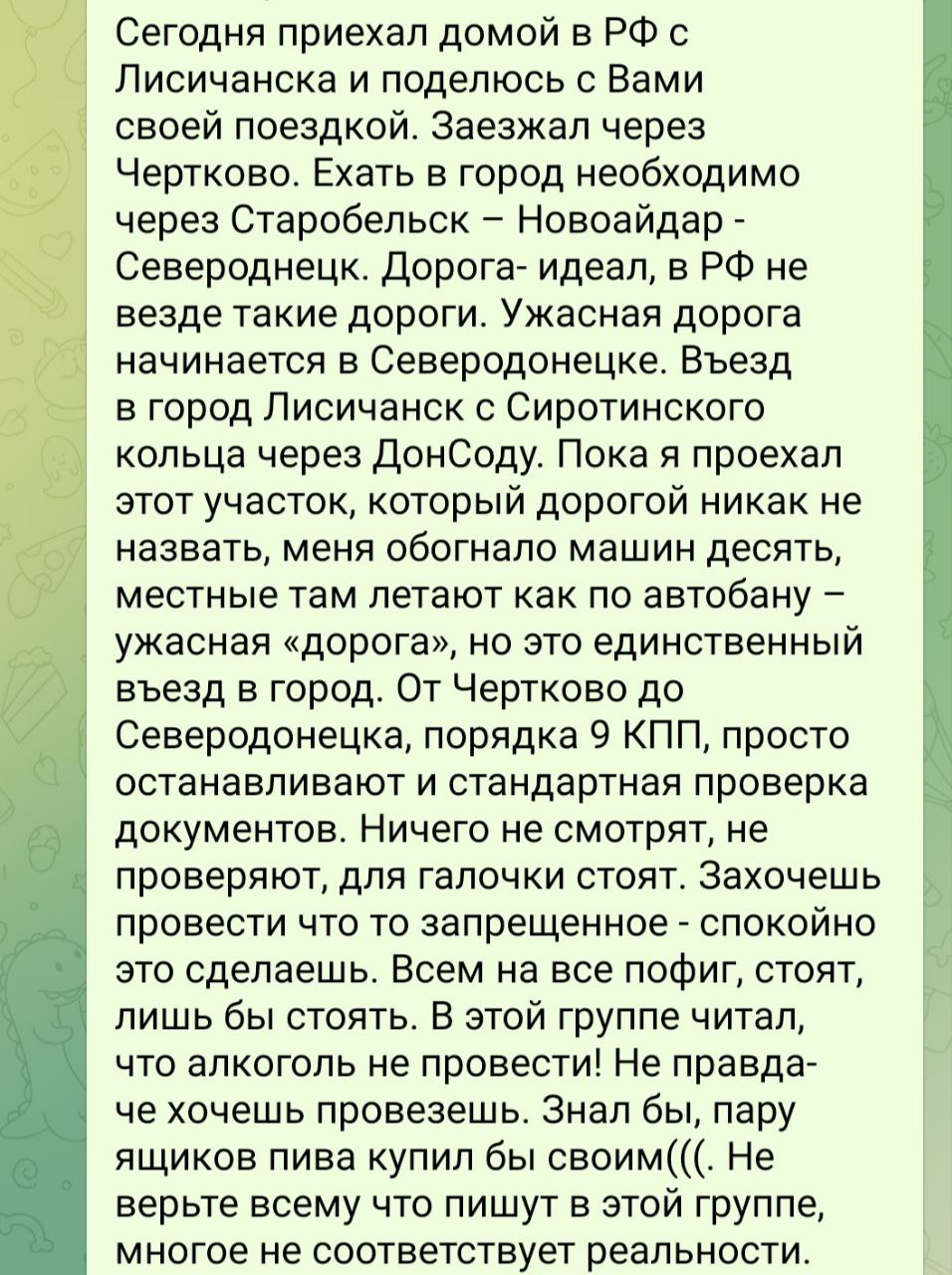 За словами користувача мережі, дістатися до міста не складно, якщо не брати до уваги жахливих доріг і приблизно дев'яти "блокпостів" на шляху проходження. Очевидець пише про перевірки "для галочки", тоді як раніше повідомлялося про те, що Лисичанськ закритий для відвідувачів .