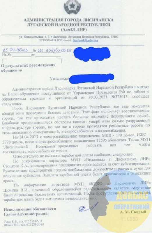 У мережі з'явилася відповідь "адміністрації" Лисичанська на звернення жителів міста до президента країни-агресора. Лисичани у своєму зверненні нарікали на відсутність відновлення міста та невиплату заробітних плат.