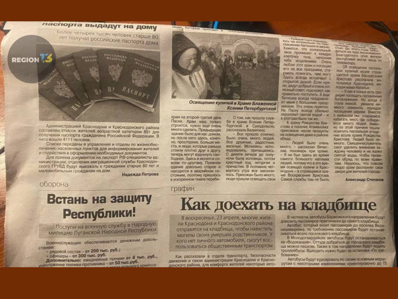 Як можна зауважити, в газеті опубліковані "найважливіші" для життя матеріали: про отримання російського паспорта, заклики "встати на захист батьківщини", а також інформація про те, як дістатися кладовища.