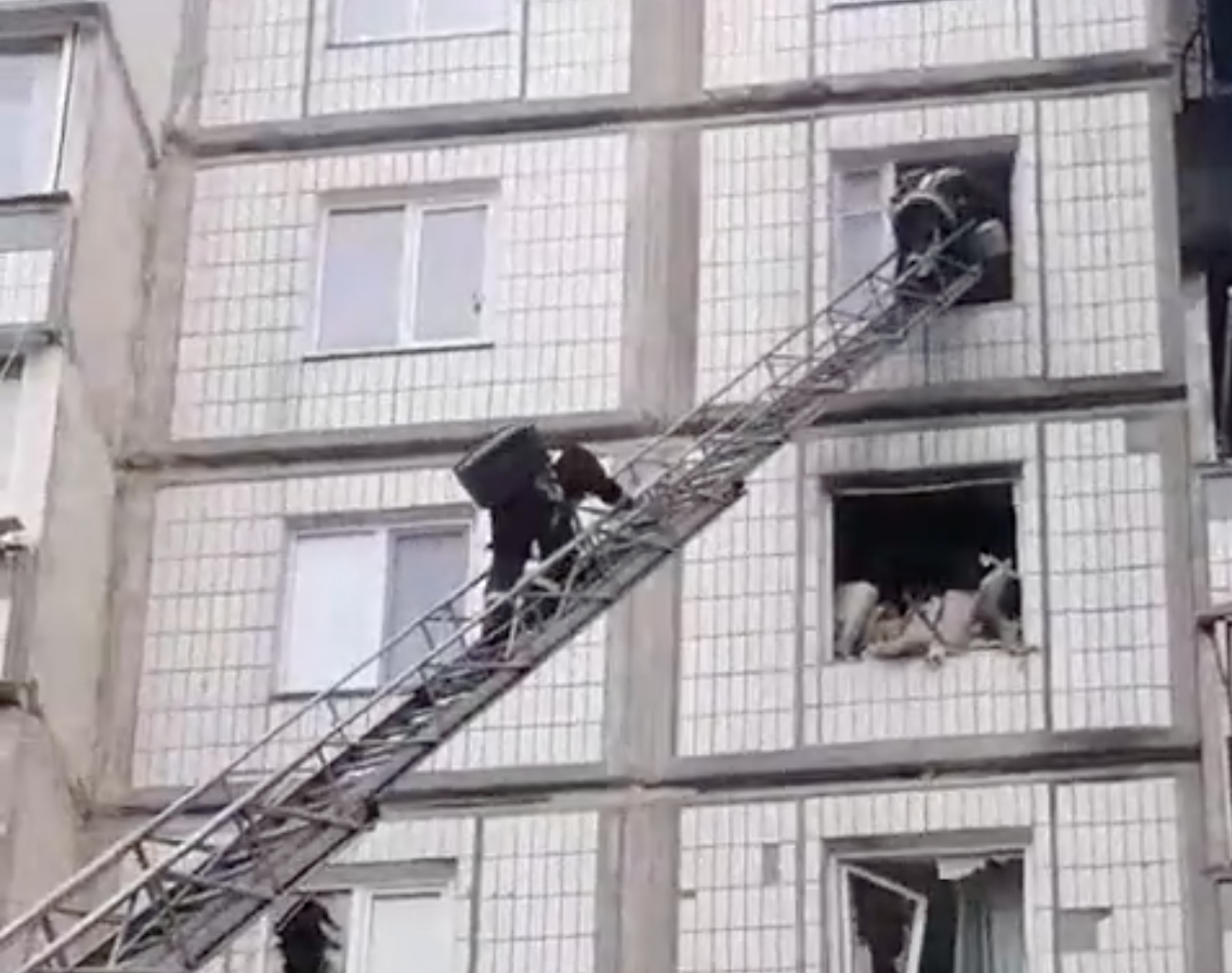 Котик вижив. Близько трьох діб він просидів на балконі зруйнованого будинку. Щоб зняти тварину з аварійної будівлі, рятувальники задіяли пожежну драбину.