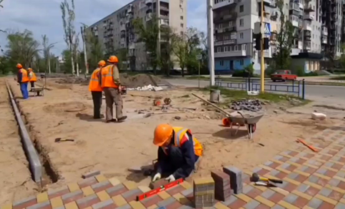 На відео росіяни намагаються показати, що нібито місто оживає. На ролику можна побачити, що навіть на тракторі присутній російський знак: свастика. Працівники кладуть плитку, де вона раніше була. Повідомляється, що, імовірно, її розмародерили місцеві дачники. А "почекуни", серед яких переважно пенсіонери, радіють так званому "відновленню" міста.