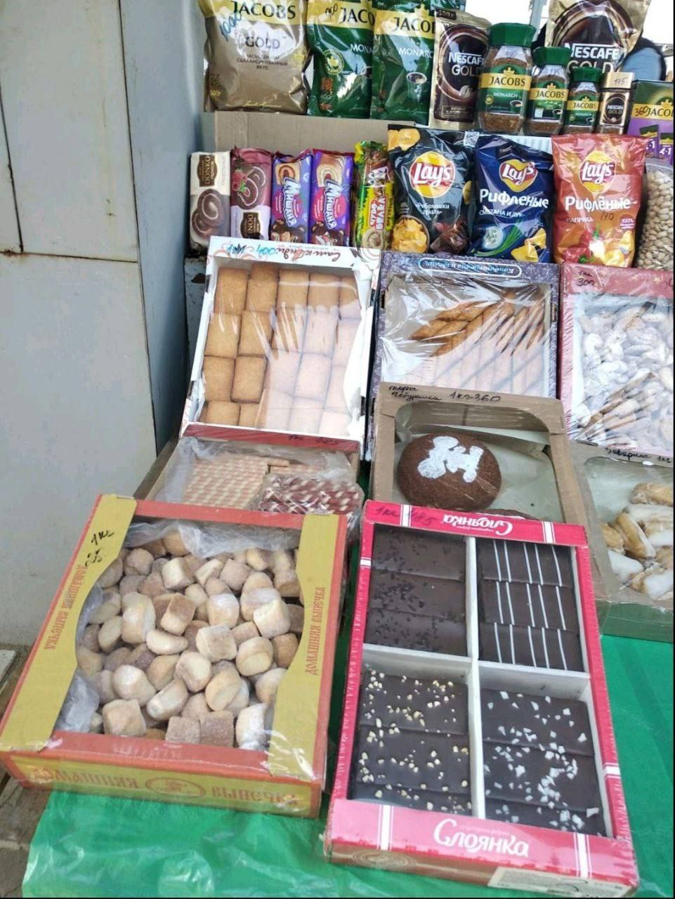 На кадрах - прилавки місцевого ринку. При детальному перегляді можна побачити, що велика пачка кави коштує 1000 рублів, печиво "Чебурашка" - 360 рублів, інший вид печива - 300 рублів. Макарони продаються за 50 руб/кг.
