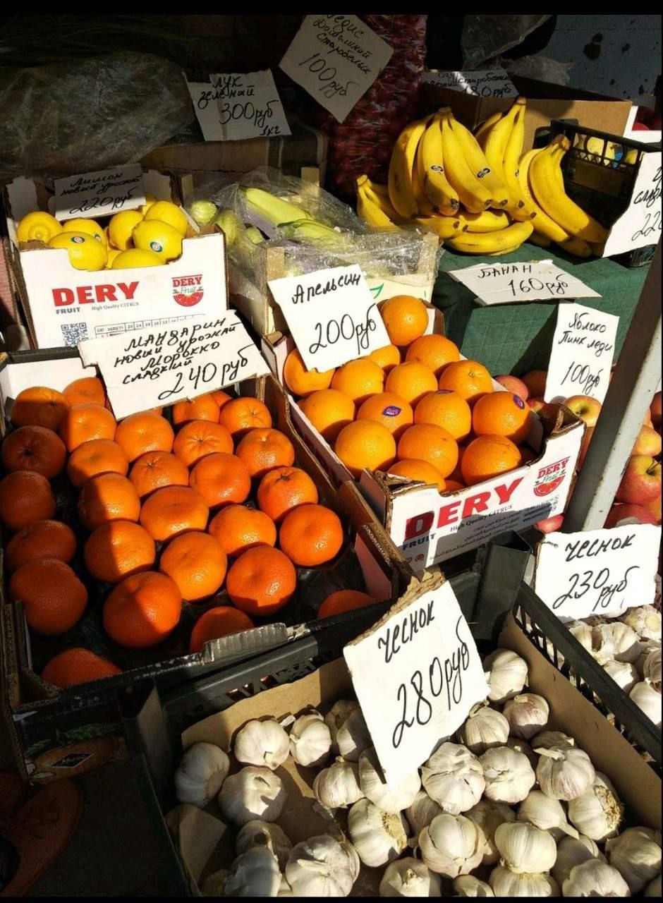 З "екзотичних" фруктів на прилавках є мандарини (240 рублів), апельсини (200 рублів), банани (160 рублів), лимони (220 рублів).