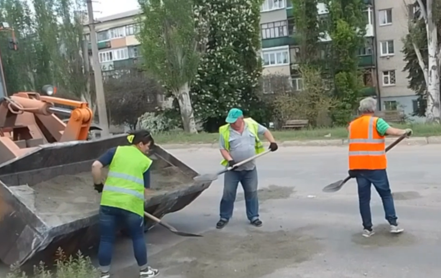 На відео, яке опублікував Telegram-канал "Донбас оперативний", місцеві співробітники комунальних служб засипають шлаком ями на дорогах, а потім затоптують ногами своє "творіння", передає Час Пік.