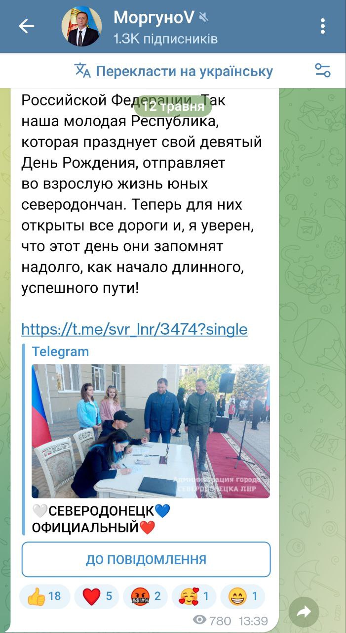 "Так званий "мер" окупованого Сєвєродонецька Микола Моргунов кудись зник. Остання публікація на каналі за 12 травня. "Відновлення" закінчилося?", - запитує Telegram-канал.