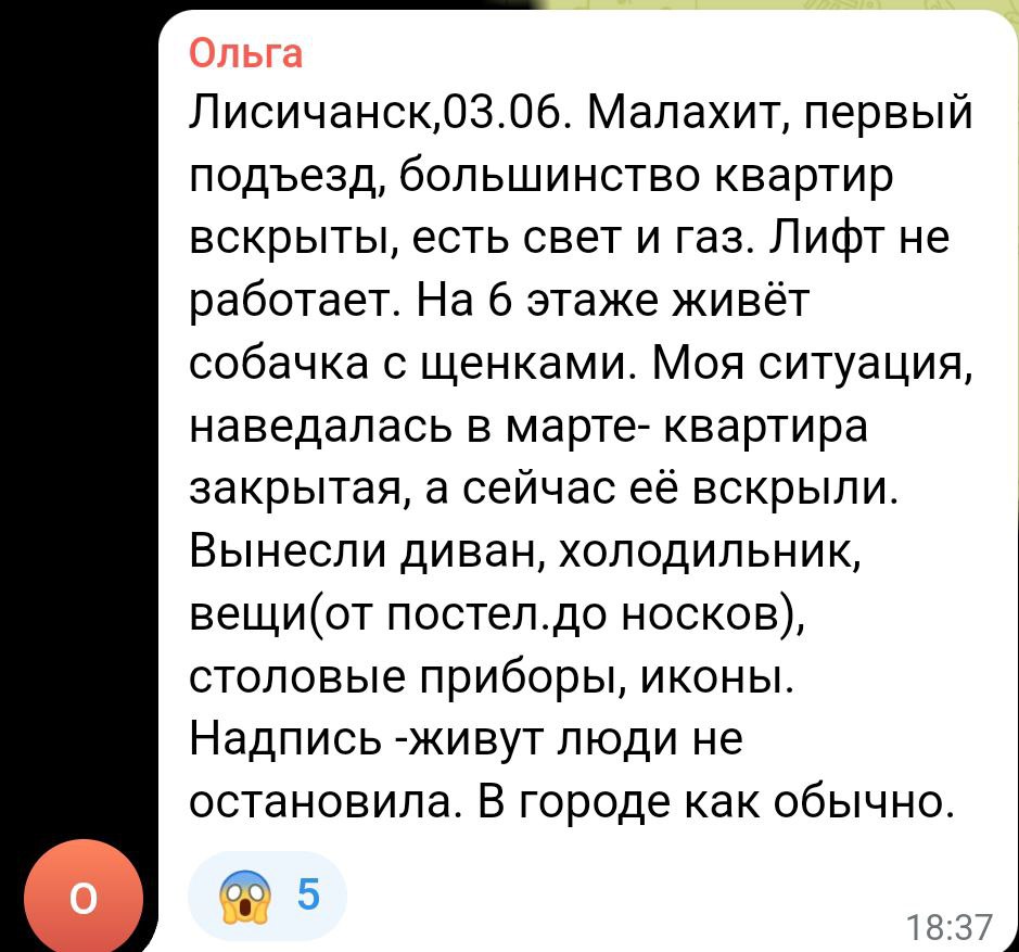 У тимчасово окупованому Лисичанську Луганської області в одному з багатоповерхових будинків вскриті майже всі квартири. Напис "Живуть люди" не зупинив ні "визволителів", ні місцевих мародерів.