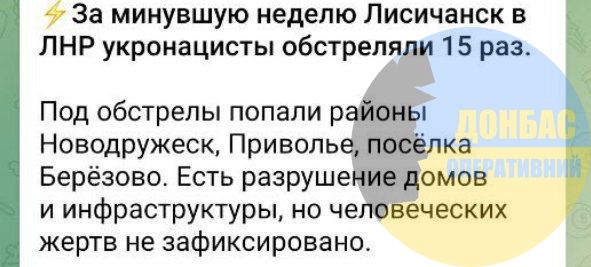 За повідомленням "визволителів" за минулий тиждень Лисичанськ "обстріляли" 15 разів. Також руйнувань зазнали Новодружеськ, Привілля та селище Березове.