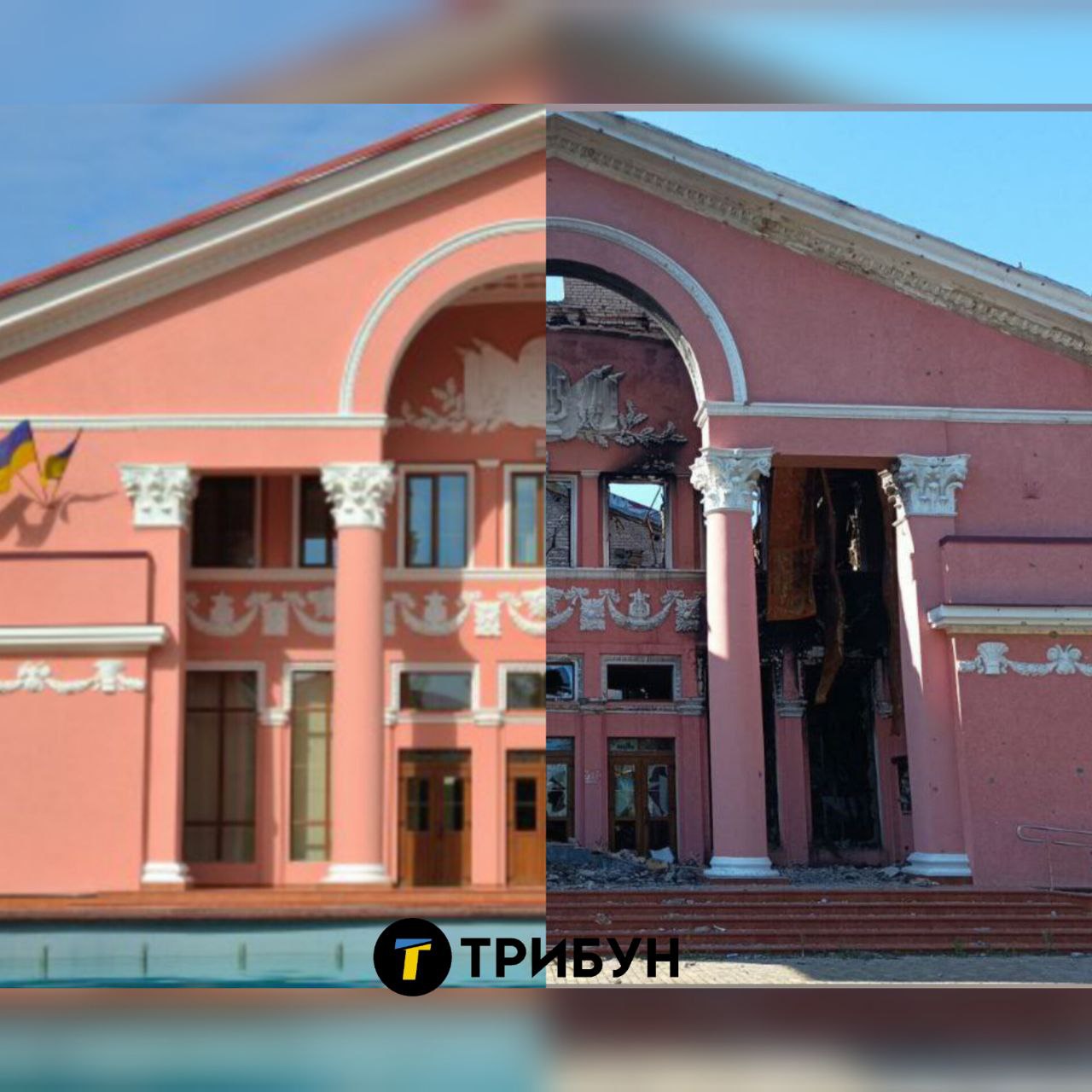 На знімках зображений Луганський обласний академічний музично-драматичний театр в Сєвєродонецьку до початку вторгнення Росії та після нього.