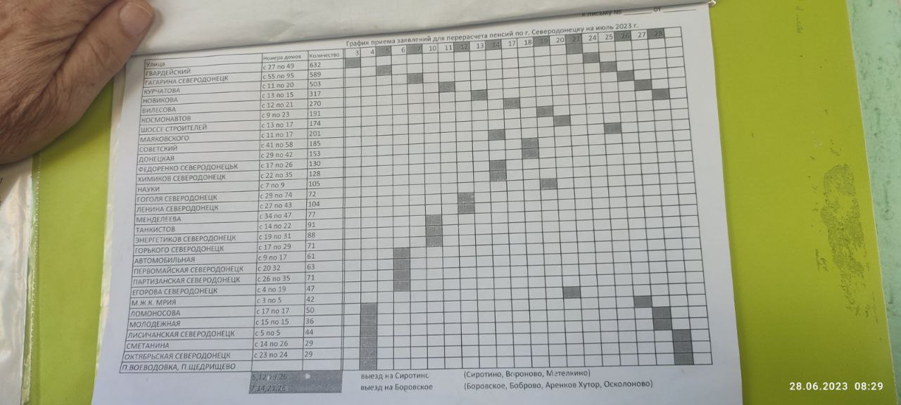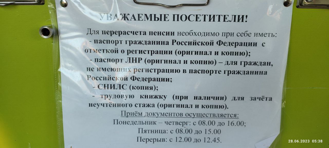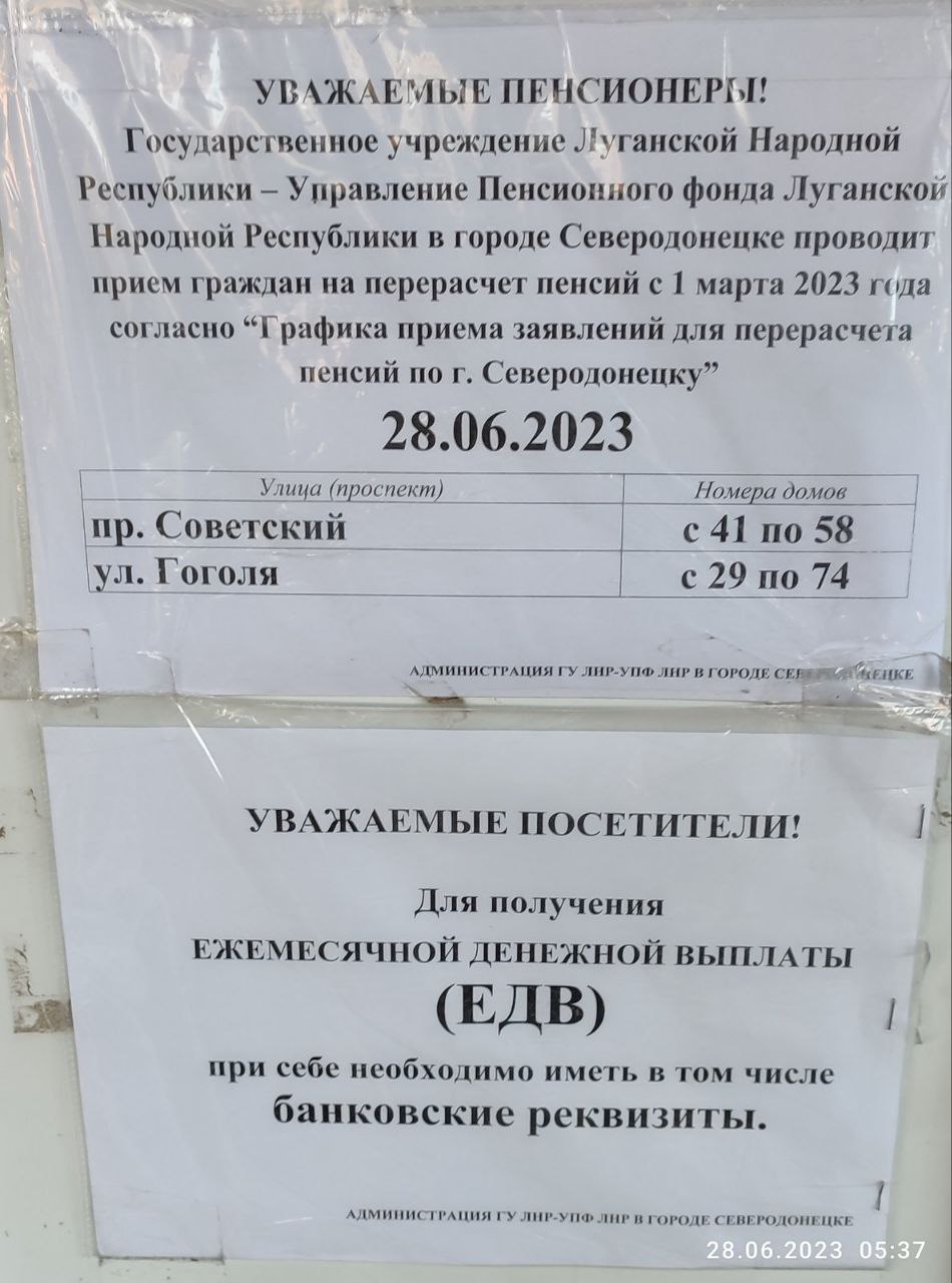 Більшість оголошень стосується пенсіонерів. Саме у парканно-листівочному форматі пенсіонерам повідомляють про те, як можна подати документи на пенсійні виплати. Організованої схеми немає. Можна припустити, що люди похилого віку змушені стояти в чергах. Так званий "пенсійний фонд" працює, як можна зрозуміти з листівок, не регулярно, а лише у певні дні та години.