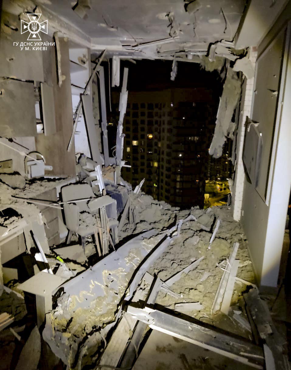 За іншою адресою у 25-поверховому житловому будинку на рівні 25 поверху сталося пошкодження фасаду будівлі без послідуючого горіння. До прибуття рятувальників на місці було виявлено 2-х потерпілих з осколковими пораненнями, їх було госпіталізовано до медичного закладу.