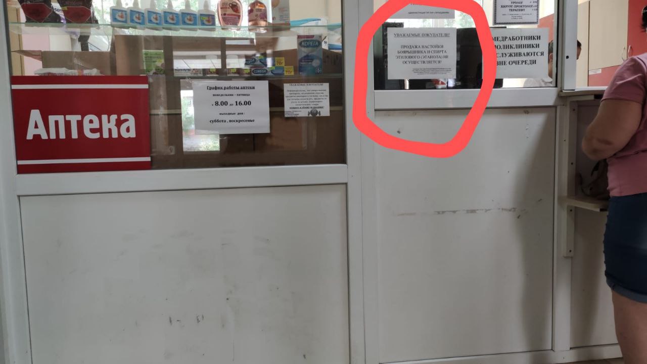 У мережі з'явились фото асортименту однієї з аптек. Повідомляється, що усього в місті їх працює дві. На знімках помітно, що асортимент там зовсім невеликий. Деякі препарати не продають, зокрема настойку глоду та етиловий спирт. Судячи з оголошення, аптека не працює у вихідні дні.