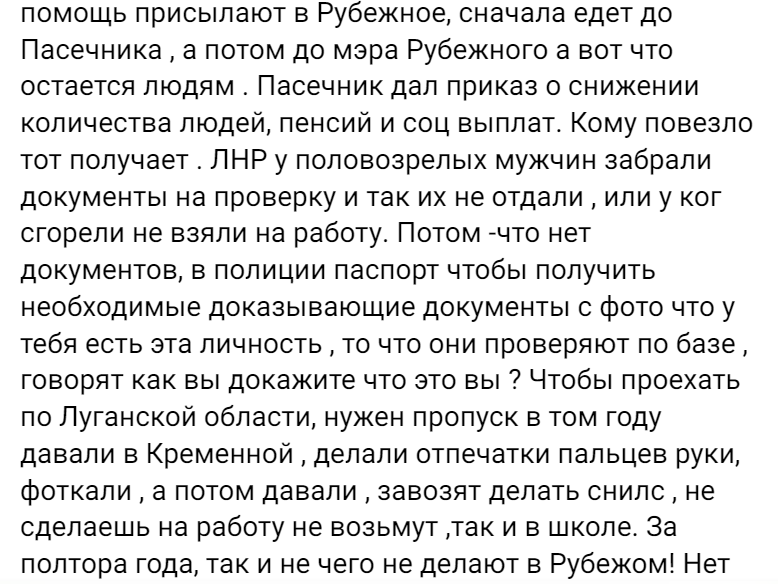 ... будматеріали не доходять до мешканців Рубіжного, бо Пасічнику та Хортіву потрібніше, перед камерою дадуть, а решта собі, так і продукти, ліки. Росія кричить, ми допомагаємо. Лишили всього, а тепер допомагаєте. Як можна прожити на 10 000 рублів мамочкам, пенсіонерам? Ви ж кричали, що житимуть добре! Чеченці того року грабували квартири, приходили як собі додому, що сподобалося - забирали, хто не сподобався - розстріл чи підвал...