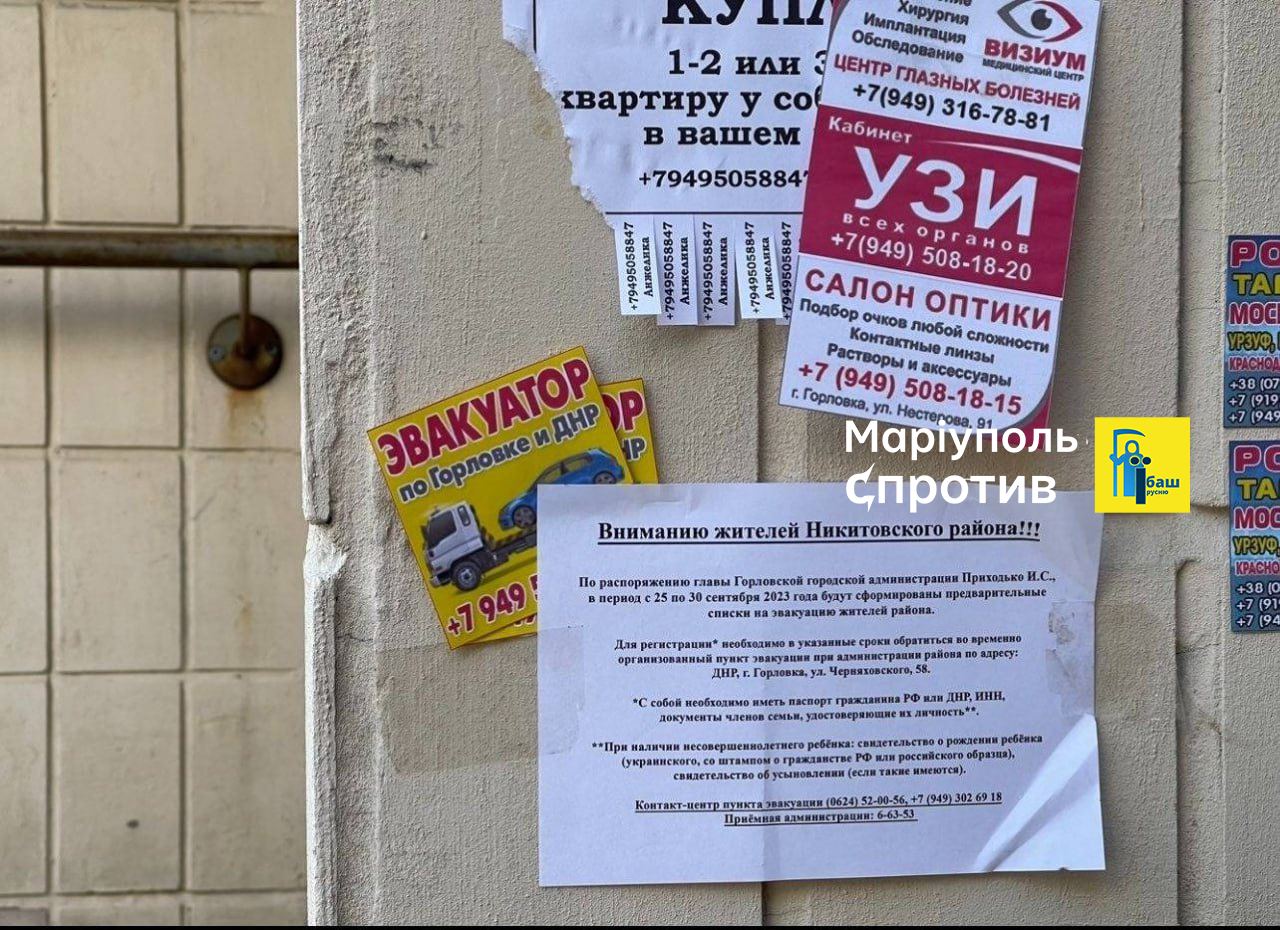 На будинках та ліфтах Микитівського району "звільненої" Горлівки з'явилися оголошення про формування попередніх списків на "евакуацію". Таке розпорядження затвердив "голова адміністрації" міста. Списки будуть сформовані у період з 25 по 30 вересня 2023 року.