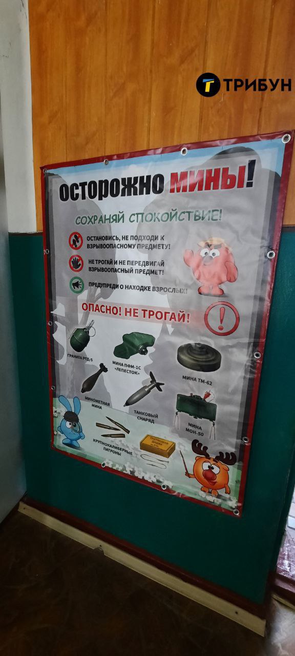 Над декількома будівлями розміщений прапор псевдореспубліки. Також на одній зі стін розміщене попередження: "Обережно, міни".