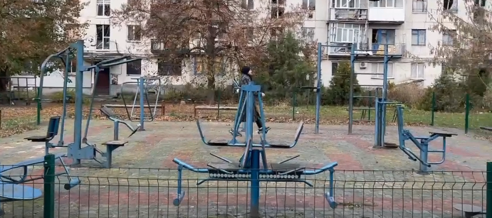 На подвір'ї, серед розбитих будинків, можна побачити лише одну людину, яка займається на спортивному майданчику, а вдалині чути звуки вибухів.