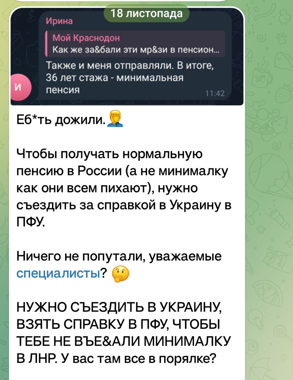 "Це було навіть ще до повномасштабного вторгнення - ПФ Мордору постійно надсилав запити до нашого ПФУ про трудовий стаж ватників, які втекли до Мордору після 2014-го",
