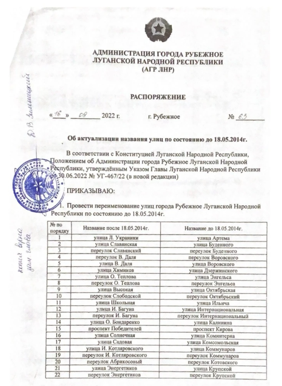 Окупаційна "адміністрація" Рубіжного видала "розпорядження" про перейменування вулиць. Вулицям міста будуть повернуті старі назви, які були актуальні до 2014 року. "Документ" підписано так званим "мером" Рубіжного Сергієм Хортівим.