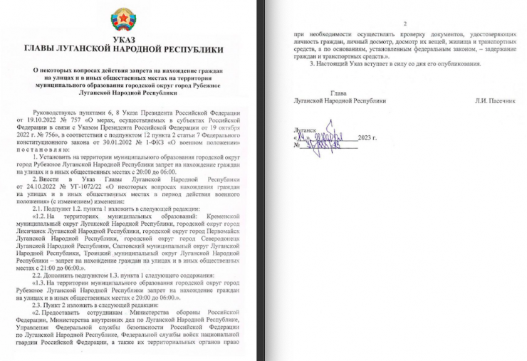 "Глава ЛНР Леонід Пасічник своїм указом встановив "комендантську годину" у Рубіжному з 20:00 до 06:00. Раніше він діяв з 19:00 до 06:00", - сказано в повідомленні.