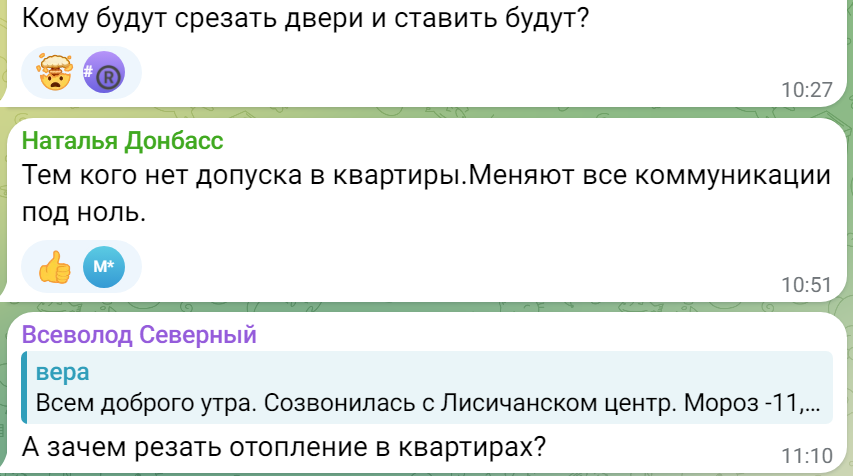 "Здзвонилася з Лисичанським центром. Мороз -11, воду привезли, бахи далеко, продовжують різати опалення, у квартирах, куди немає доступу поки що нічого не роблять. Чекають на двері, будуть зрізати й відразу ставити нові. А в іншому все нормально", - повідомляють в мережі.