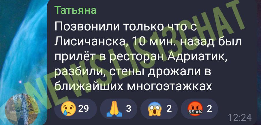 "Зателефонували щойно з Лисичанська, 10 хв тому був приліт у ресторан "Адріатик", розбили, стіни тремтіли у найближчих багатоповерхівках",