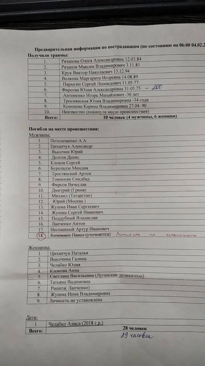 Судячи зі списку, які опублікували пропагандисти, загинули 18 чоловіків, 9 жінок та одна дитина, повідомляє Час Пік.
