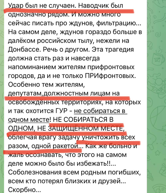Російські ЗМІ зараз намагаються видавати їх за "мирних мешканців", але окремі пропагандисти вже починають потроху визнавати реальну картину. Закликаючи колаборантів та гауляйтерів більше не збиратися, щоби всіх разом не вбило однією ракетою.