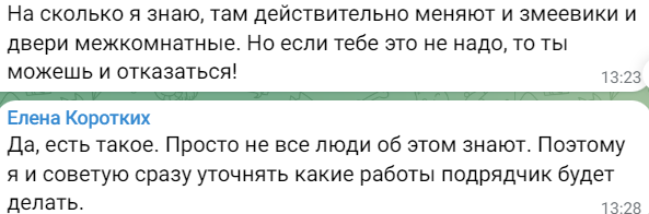"Я хочу сказати за ремонти квартир. Сєверодонецьком, але це ж напевно буде актуально і для Лисичанська. У моєї тітки відремонтували будинок (поміняли, вікна, труби, батареї). І коли я приїхала до неї наприкінці жовтня, якраз у цей А день прийшли до неї з військової поліції з економічних питань, вони якраз перевіряли якість виконаних робіт, бо підрядник уже здав їм усі папери та кошториси, отож по паперах виходило, що повністю замінені міжкімнатні двері та змійовики, а їх ніхто й не пропонував міняти. Тому варто відразу запитувати про те, що буде зроблено".
