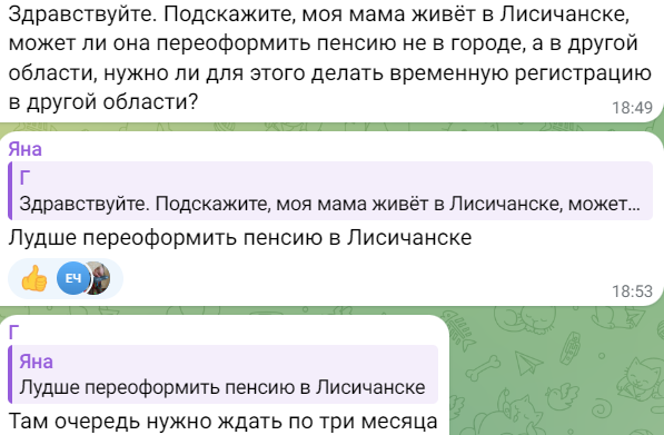 "Телефонувала бабуся з Лисичанська. Пенсія 12.500 після перерахунку. Стаж безперервний 36 років. Ходила після перерахунку до ПФ Лисичанська. Чому так мало? Відповідь. Поки що так, нам як дадуть більше, так і отримаєте... Нормально? Користуються тим, що ні інтернету, люди ноги б'ють, старі. Бабуся каже, історія така не в неї однієї. Поки всі старі стоять за водою, те саме розповідають, як їх футболять з Лисичанського пенсійного фонду і що робити не знають",