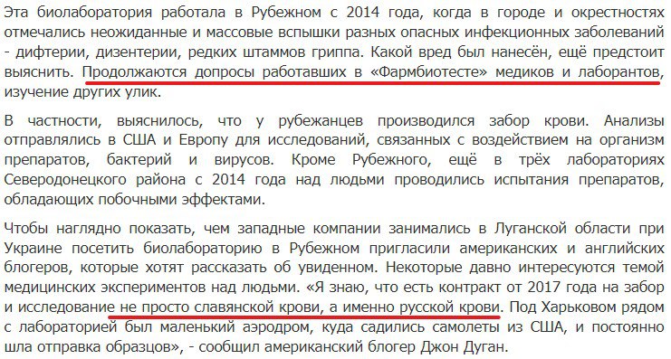 Раніше російська пропаганда поширювала фейк про "роботу українсько-американських лабораторій" у рубіжанському клінічному центрі "Фармбіотест", де нібито проводилися випробування над людьми . "За 666 гривень добровольці ставали піддослідними кроликами".