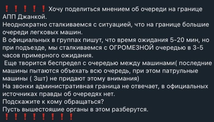 Очевидці повідомляють про гігантські автомобільні черги, які регулярно виникають на КПП Чонгар (РФ називає його "Джанкой").