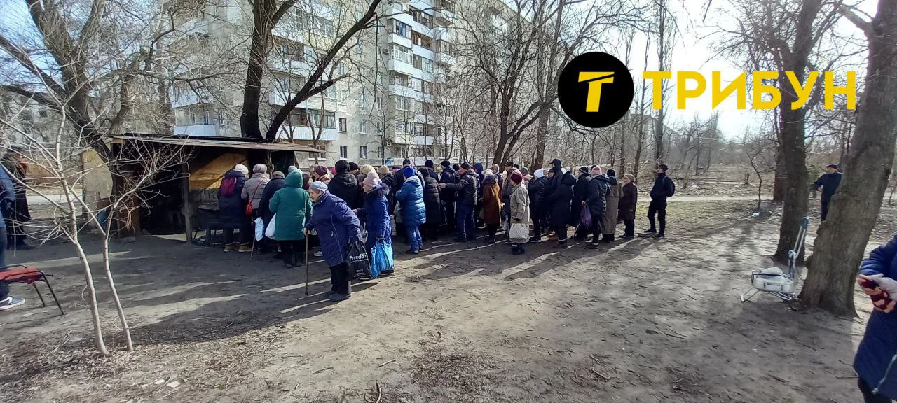 На фото, які датовані березнем 2024 року, "звільнене" від нормального життя місто, у якому на проспекті Космонавтів відбувається видача пенсіонерам борщу.