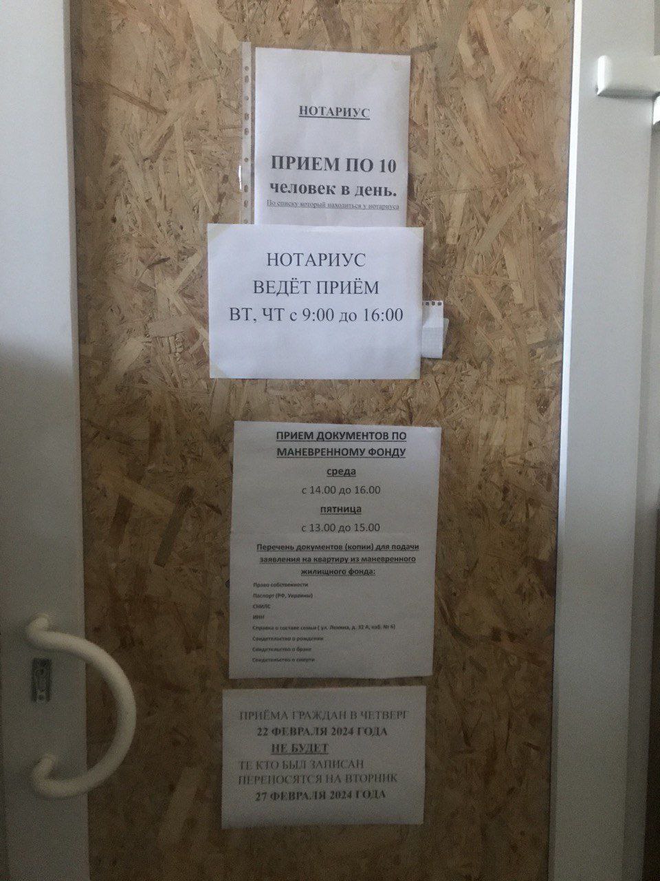 До мережі потрапило фото, зроблене біля входу до нотаріальної контори. Прізвище нотаріуса ніде не вказується. Однак у мережі уточнюють, що прийом у Сєвєродонецьку здійснює нотаріус із Лисичанська.