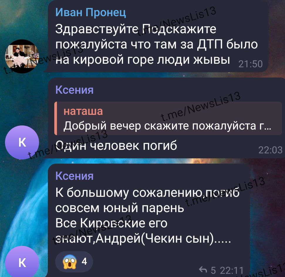 Вчора, на Кіровій горі, у місті Лисичанськ, Луганської області, сталася страшна дорожньо-транспортна пригода. За повідомленнями із прросійських джерел, внаслідок аварії водій вижив, а пасажир помер від отриманих травм на місці пригоди.