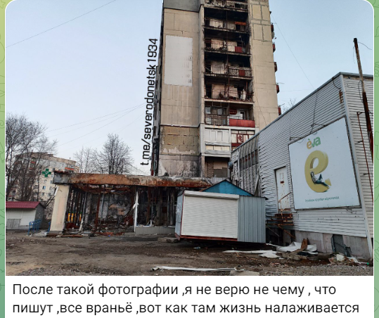 "На ГТВ 4 мікро: світло, вода, газ, тепло все є. Гуманітарка надходить. Вчора роздавали. Незабаром почнуть робити капітальний ремонт у всіх будинках. Заміна трубопроводів на воду, заміна батарей, вікон, каналізацію. Життя налагоджується. Якщо уважно і не поспішаючи ходити містом, то видно, як постраждали будинки".