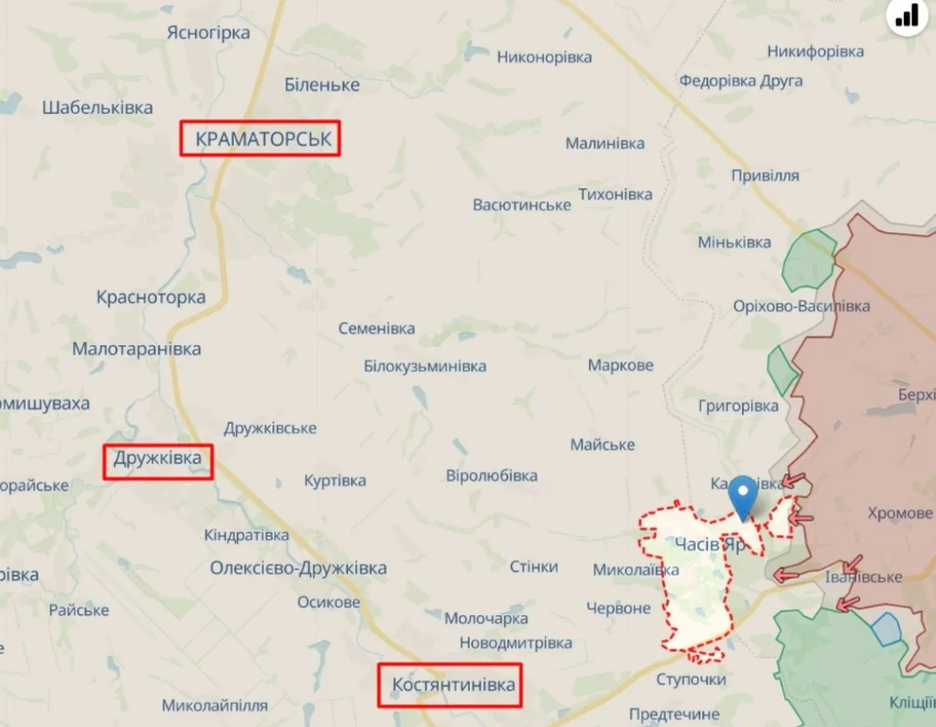 На карті бойових дій DeepState можна виміряти відстань від Часового Яру до міст, названих Федоренком. Усі вони — на відстані, досяжній для артилерії ЗС РФ: до Костянтинівки — 8 км, Дружківки — 20 км, Краматорська — 23 км.