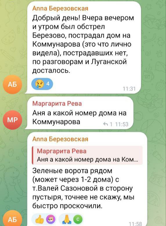 За словами місцевої жительки, вчора ввечері й сьогодні в ранці сталися "прильоти" у районі Березово. Очевидиця розповіла, що постраждав будинок по вулиці Комунарів та Луганській "дісталося". Постраждалі серед цивільного населення відсутні.
