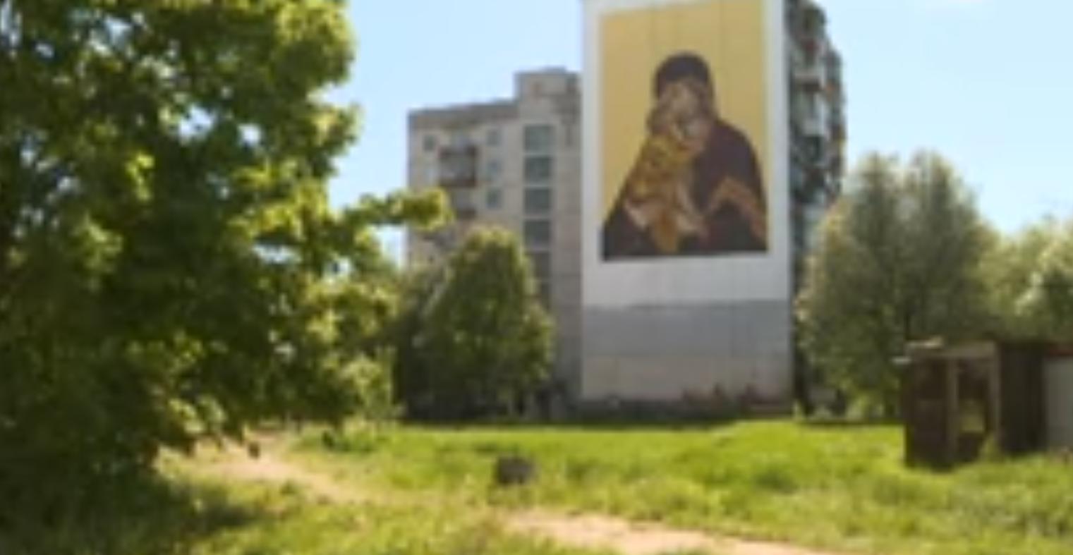 "Головний художник з Калузької області разом із помічниками вже 10 днів створює мурал. Ікону для нього вибрали символічну... Залишилося домалювати німб і деякі деталі...", - йдеться на відео.